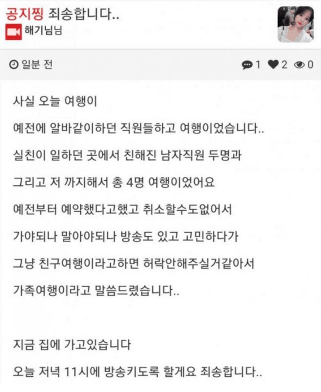이후 해기는 해명 방송을 진행하며 7월 한 달간 노휴방을 선언했습니다.